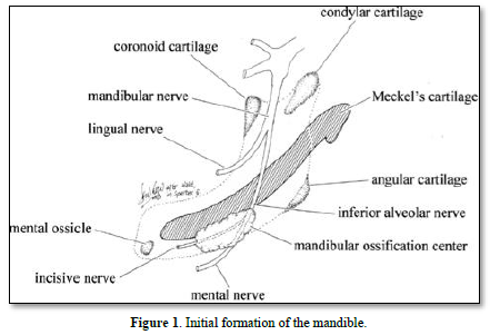 The mandible is formed initially by the Meckel’s cartilage. Afterward, a series of cartilages contribute to the formation of bone (condylar, coronoid, angular, mental), leading to the formation and mineralization of endochondral bone (Figure 1).