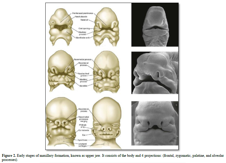 The maxillary bones are formed by the association of fronto-nasal process, the medial nasal, lateral nasal, all being located above the maxillary process. Fusion between the right and left parts of the maxillary occurs in the median nasal process. The maxillary bone is implicated in the formation and mineralization of membranous bone.
