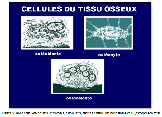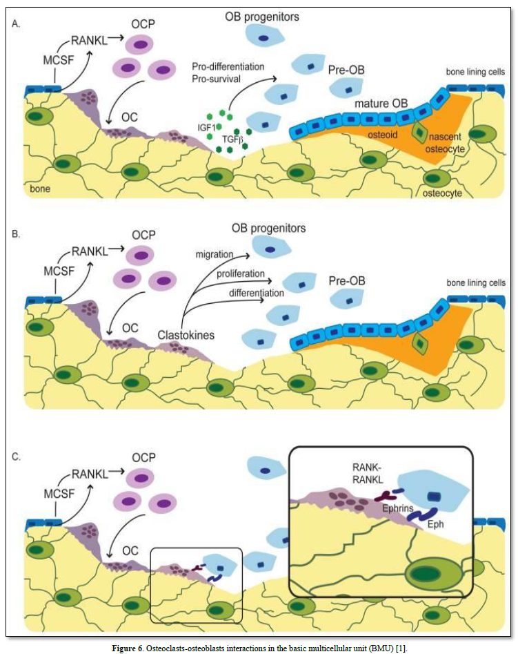 Progenitors of bone cells (bone lining cells and pre-osteoblasts), osteoblasts and osteocytes are expressing chemokines, prostaglandins and growth factors (BMPs, TGF-CSF-1, G-CSF-, basic FGF, and IGF). The other group of bone cells is composed by osteoclasts (OC), derived from hematopoietic stem cells and monocyte/macrophage lineage cells. They play role in cellular senescence, appear as progenitor cells included in bone marrow. OC are also implicated in bone resorption and decomposition of the extracellular matrix. M-CSF (macrophage colony-stimulating factors), and IL-34 are ligands of colony stimulating factor 1 receptors, modulating macrophage activation. OC are multinucleated cells (between 10 and 20 nuclei). Interleukin vstimulates the differentiation of OC progenitors. The RANK signaling pathway contributes to OC activation. They migrate at the surface of bone and they are involved in a resorption phase creating osteoclastic lacuna. OC are limiting the sealing zone, surrounded by an actin-ring organizing podosomes in the clear zone. OC are loaded by small vesicles and mitochondria. Chloride/ bicarbonate provides insights in the mechanisms of osteoclastogenesis. Cathepsin K, MMP-9 and TRAP are enzymes implicated in the degradation of the extracellular matrix. Degraded matrix components are endocytosed. Transcytotic vesicles secrete acid and lytic enzymes. Howship’s lacuna includes secretory lysosomes merging with the plasma membrane, limiting a sealing zone implicated in bone resorption. They initiate the secretion of parathyroid hormone (PTH) and related peptide (PTHrP). OC are implicated in pathological conditions including osteoporosis, Paget’s disease, rheumatoid arthritis, and periodontitis.