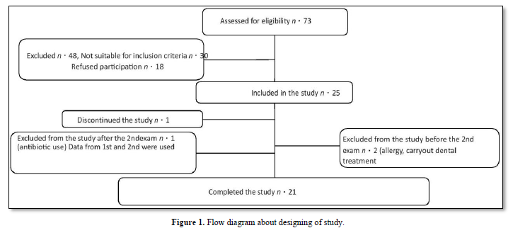 Throughout the time accessible to the research's development, a convenience selection was conducted, with 73 patients being qualified. Due to the inclusion and exclusion criteria and access, just one representative sample of 25 persons could be included, which is consistent with what was suggested [17,18] for phase II studies (Figure 1). The research team included twenty-one people (10 males and 11 females). Others departed from the research for a variety of reasons, including one who sought dental treatment throughout the research and was eliminated; second who had a suspected allergy to propolis; one who left due to having felt hyper sensibility on teeth; and one who was excluded for taking antibiotics owing to illness. This recipient's data was incorporated in the 45-day analysis.