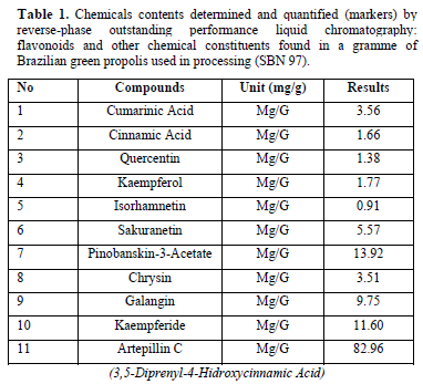 The following was a three-month follow-up phase II interventional investigation carried out at the Department of Public Health Dentistry, Varun Arjun Medical College and Rohilkhand Hospital, Banthara, Shahjahanpur from August 2022 to April 2023. The alcohol-free mouthwash containing 5% w/v Brazilian green propolis (MGP 5%) used in that study was handled by Pharma Ne'ctar in accordance with our request, in accordance with ANVISA [9] and in accordance with ISO 9001 and GMP International. A solution including glycerin, sodium benzoate, and filtered water was supplemented with 5% propolis dry extract (w/v). The quantity in mg/g of the principal chemical markers discovered in green propolis employed in the recipe of the mouthwash research is shown in Table 1.