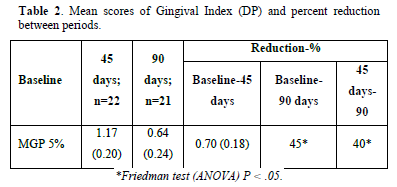 In the present investigation, data were analyzed using the statistical program SPSS Version 21. For getting a nonparametric distribution, the mean modified in the starting point for both scores of the modified Plaque Index of Quigley-Hein [10] and modified Gingival Index of Lo e-Silness [11] as well as the equivalent severity scores were contrasted via covariance analysis, by Friedman test, for data obtained at 45 and 90 days of the research. All statistical hypotheses tests had two strands, and a significance level of P.05 was used [15,16].