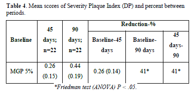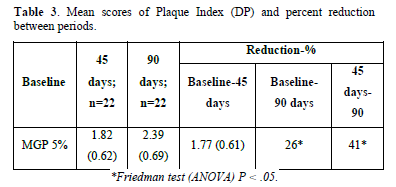 Gingivitis and Gingival Severity: The mean baseline Gingival Index GI scores at 45 and 90 days were reported. The MGP 5% revealed a decrease in gingivitis of more than 40%, which was statistically significant when compared to the baseline scores of 45 and 90 days (P.05). However, there was no statistically significant reduction in gingivitis when contrasting 90-day to 45-day scores (Table 2). The MGP 5% reduced the rate of the surface with plaque index scores of 3, 4, and 5. When comparing the mean baseline scores with 45 and 90 days (P.05), the decrease was statistically significant (more than 70%). There wasn't no statistical significance when the mean scores of 45 and 90 days were compared (Tables 3 & 4).