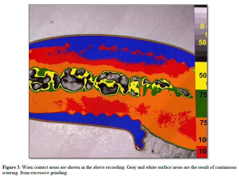 Health and disease can be evaluated. If dental treatment is instituted and completed it is the practicing clinician who is responsible for the patient’s health. How does a clinician address occlusal health in a patient population? (10). A dental hygienist is a good ambassador.to explain the positive aspects of a sound occlusion. Do current practitioners learn about the science of the occlusion in dental school? Dental training should Include the principles of functional articulation. Do restorative dental teachers reach out to clinical practitioners? The educational system is complex and rarely discussed. How does a clinician know what to do? The biomechanics of tooth function indicate that teeth establish a pattern of wear and that tooth surfaces wear out Figure 3. Theoretically teeth should articulate smoothly with one another but they rarely do. What is the clinician’s responsibility? As children mature the family dentist can monitor their occlusion using the scan and make occlusal adjustments. Slight changes in the cuspal alignment of a tooth can interrupt the intended path to a cusp fossa relationship. If a cusp binds upon occlusal contact a tooth may not fully engage it’s counterpart and the mandible may shift to accommodate the obstruction. Something so remote as cuspal interference can begin the grinding process. If a small occlusal restoration is placed in hyper or hypo occlusion it may not fit readily into the opposing dentition. Small aberrations can cause mandibular dysfunction. An imperfect bite becomes a problem. How can we examine an occlusion intraorally when the view is obstructed? It is not possible. There is no shortage of implant driven restorative work but there are few occlusal recordings that can be used to evaluate the success and failure of the work. The costs for dental restorative work are prohibitive so why do we minimize prevention? If most of the population suffers from dental disease and much of it originates with the occlusion then why don’t we diagnose and treat the occlusion? Examining the occlusion is usually quick and inconclusive. Occlusal malfunction remains hidden and out of sight. A clinician can only examine an occlusion using a specific scan developed to record the elements of occlusal contact and associated closed contact movements. Areas of contact are recorded intra orally and examined extra orally (11). Understanding and studying the patterns of occlusal contact requires careful examination. Clinical training is required. Permanent records are made in a triple tray loaded with impression material. The tray is carefully positioned intra orally and an inter occlusal record is taken. Once made the record is placed on an illuminated light surface located at the base of the scanner. An overhead camera takes a picture and makes a permanent record. An image analysis program (Image J) is used to establish black and grey densities in the photograph and to convert them into a graded calibrated color scheme. Contact and near contact areas are viewed extra orally. White is contact. Black is 50 microns distance from white.