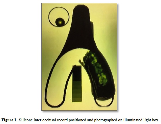 To make a permanent record an inter occlusal impression is made in a triple tray and the impressions is positioned on an illuminated light box (9). A photograph is taken from above and a permanent record is made. The resultant black and white photograph is processed using an image analysis program. Density changes are measured and recorded. A calibrated color scheme is added for visual assessment (10). The color red signifies occlusal contact Figure 3. This recording system is accurate. It was constructed to measure occlusal contact. The making and taking of an accurate impression is the controlling factor. It takes time to learn about the dynamics of occlusion. Practice is suggested.