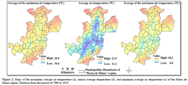 At the sampling sites, key environmental variables were analyzed, including coffee variety, altitude, and slope orientation, to assess their influence on coffee quality. Figure 2 presents the region’s climatic conditions, highlighting annual maximum, minimum, and mean temperatures. Climatic data were sourced from the TerraClimate database, covering the period from 1960 to 2014, providing a robust historical assessment of the environmental conditions impacting coffee production.