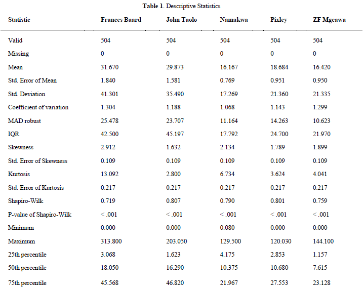 Table 1 shows the descriptive statistics of precipitation datasets across the five district municipalities in the Northern Cape: Frances Baard, John Taolo, Namakwa, Pixley, and ZF Mgcawa. These statistics provide insights into rainfall distribution, variability, and the presence of extreme values in each region. Frances Baard and John Taolo record the highest mean precipitation values, at 31.67 mm and 29.87 mm, respectively. In contrast, Namakwa, Pixley, and ZF Mgcawa show considerably lower mean values, with Namakwa receiving the least precipitation at 16.17 mm. This trend indicates significant regional disparities in rainfall, with Frances Baard and John Taolo experiencing relatively wetter conditions, while Namakwa and ZF Mgcawa remain drier. The standard deviation values further reinforce this variability. Frances Baard exhibits the highest standard deviation (41.30 mm), followed by John Taolo (35.49 mm), suggesting that these regions experience substantial fluctuations in rainfall. The lower standard deviation in Namakwa (17.27 mm) and ZF Mgcawa (21.33 mm) indicates relatively stable precipitation patterns, albeit at lower levels. The coefficient of variation (CV) provides an indication of relative dispersion in rainfall data. Frances Baard (1.304) and ZF Mgcawa (1.299) exhibit the highest coefficients, suggesting more erratic rainfall patterns with a high degree of fluctuation relative to the mean. Conversely, Namakwa (1.068) has the lowest CV, implying more consistent precipitation trends despite receiving lower rainfall. The interquartile range (IQR) values show the spread of the middle 50% of the data. Frances Baard (42.50 mm) and John Taolo (45.19 mm) display the widest IQRs, reflecting greater variability in their rainfall distributions. Namakwa has the narrowest IQR (17.79 mm), signifying less dispersion in its rainfall data.