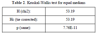 The Kruskal-Wallis test shown in Table 2, was conducted to assess whether median precipitation levels significantly differ among the five district municipalities in the Northern Cape: Frances Baard, John Taolo, Namakwa, Pixley, and ZF Mgcawa. Given the non-normal distribution of precipitation data, as established in Table 1, this non-parametric test was employed to determine if the observed differences in rainfall medians across districts were statistically significant. The test produced a chi-square value (H) of 53.19, indicating a substantial degree of variation in precipitation distributions among the districts. A higher H-value suggests greater differences between the median rainfall values of the respective regions. The tie-corrected statistic (Hc) was also 53.19, confirming that tied ranks did not affect the results. The key finding is the p-value of 7.76 x 10-11 (< 0.001), which strongly indicates that the differences in precipitation medians across the five districts are statistically significant. This result confirms that rainfall levels are not uniformly distributed, reinforcing the disparities observed in Table 1. The significant variation indicates that certain regions, such as Frances Baard and John Taolo, experience markedly different precipitation patterns compared to Namakwa, Pixley, and ZF Mgcawa. The findings suggest that precipitation patterns in the Northern Cape are highly heterogeneous, necessitating region-specific approaches to water resource management, agricultural planning, and climate adaptation strategies. The presence of statistically significant differences in rainfall distribution implies that a uniform policy for all districts may be ineffective. Instead, targeted interventions tailored to each district’s unique precipitation characteristics are recommended to ensure sustainable water management and disaster risk mitigation.