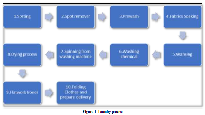 The laundry process (Table 1) of a hotel where samples are collected, it can be divided into 10 steps for easy understanding. Between white and non-white linen and towels, the same steps are used excluded prewashing step for non-white linen and towels. Time spending of washing non-white linen and towels is less than washing white clothes approximately 15 min. Therefore, the statistics will be calculated based on initial assumptions between washing white and non-white linen and towels for this case study. There will be differences in water and energy usage, as shown in the following analysis.