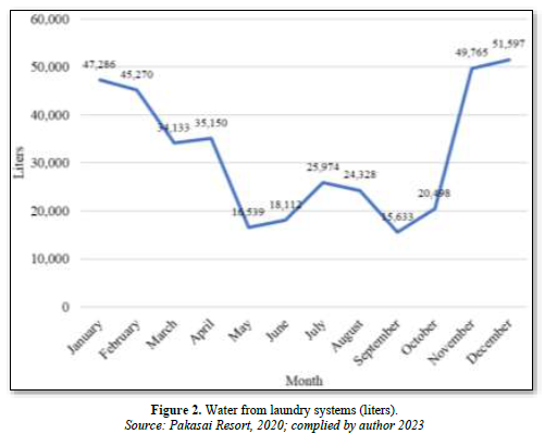 Preliminary data from Figure 2 was found that in the hotel's laundry process, water usage decreased by 384,282 liters. Considering monthly was found that the months in which highest water, was due to the highest number of occupied rooms of the month in High Season, December 2019. It was found that water use decreased by 51,597 liters and the month with the least water use was due to a decrease in laundry due to a lower occupancy rate. The lowest was September, which was 15,633 liters.