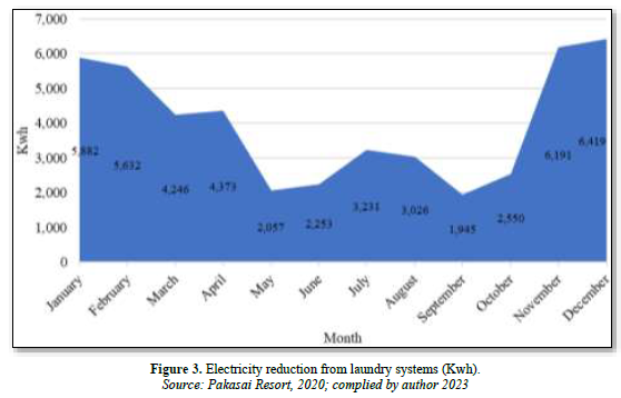 Electricity consumption from Figure 3, the laundry process, was linked to the number of occupied rooms. It was found that in December in 2019, there was a decrease of electricity consumption from laundry at 6,419 kilowatt hours because the highest number of laundry delivery. The electricity consumption reduced 1,945 kilowatt hours was in September, 2019. This behavior profile reflects the relationship between the number of occupied rooms and the amount of laundry for this case study.