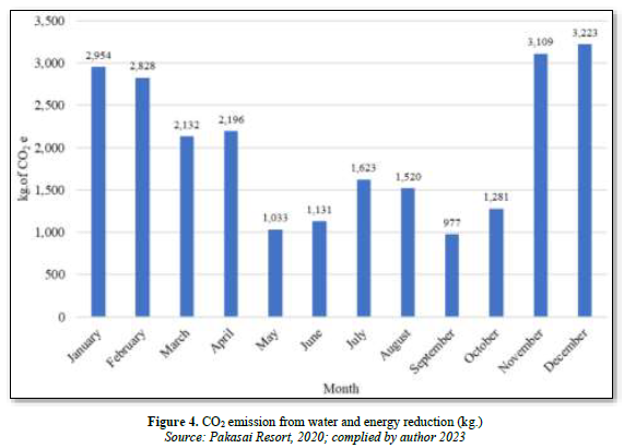 Considering of the Figure 4 found that water reduction from the Pakasai Hotel's used for laundry system. Results showed that, in 2019, there was a total reduction in water of 384,282 liters, which is equal to 109 kilograms of carbon dioxide equivalent.