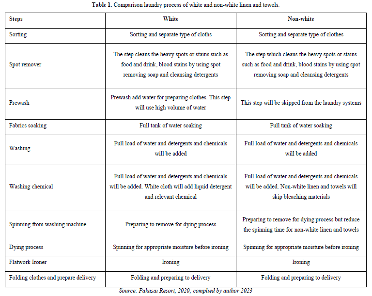 The results of the study found that laundry processes of non-white linen and towels are more water and energy efficiency than white linen and towels. Table 1 shows comparison of laundry processes that non-white linen and towels will have less process specially the third step is prewash. The assumption found that overall washing time between washing white and non-white linen and towels in the hotel's laundry process reveals that the time for washing non-white linen and towels is 15 min less than the white.