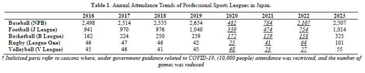 In Japan, the professionalization of various sports has been on-going, and the sports spectators’ population is increasing every year (excluding the period during which COVID-19 preventive measures were implemented (Table 1). For individuals, there are various benefits by sports spectating, such as maintaining and improving mental health [1] enhancing quality of life [2-3] and offering new learning opportunities [4-5]. In addition to these benefits by spectating for individuals, expanding the spectator population can also make contribution to the popularization of the sport and the overall improvement of competition and performance [6,7] thus making it an important issue for many sports organizations [8]. There are numerous factors that can influence behavior of sports spectators, and they are: gender, age, economic status, educational level, residential area, and sports participation level.