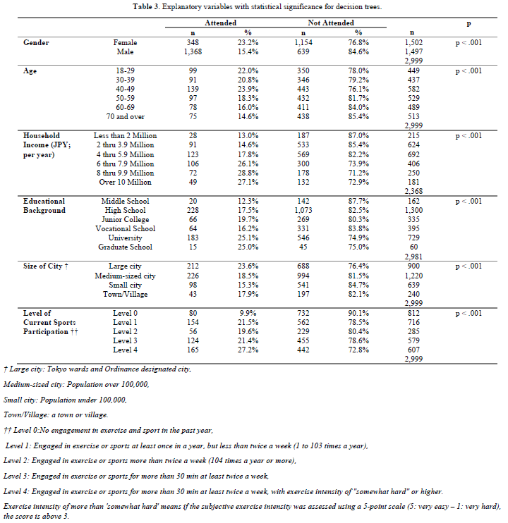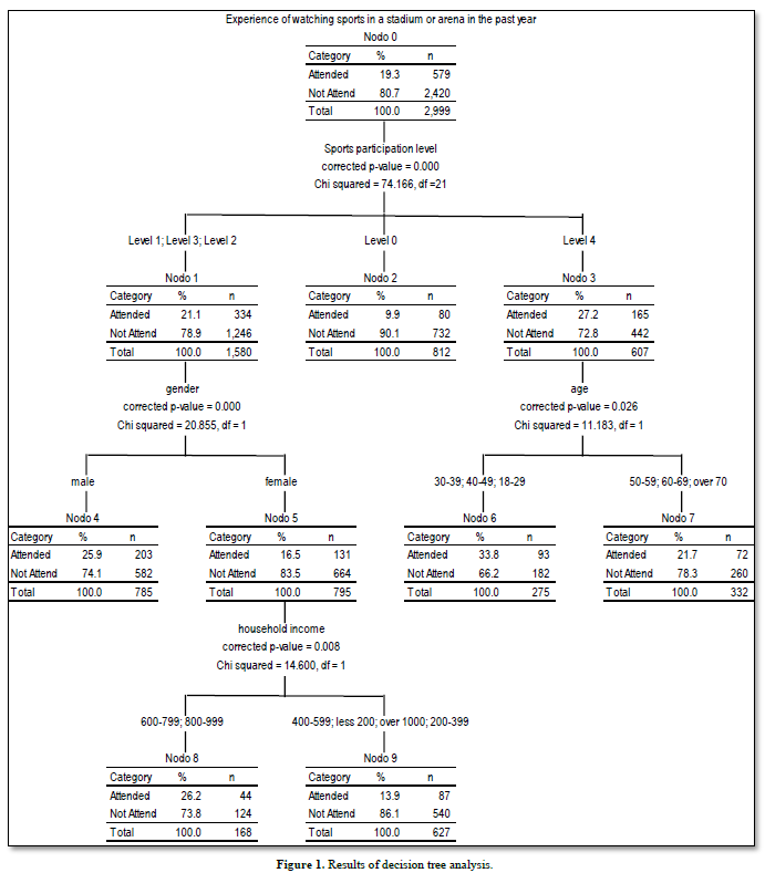 As shown in Table 3, all variables used as explanatory factors in the decision tree analysis (age, household income, educational level, size of city, and level of current sports participation) were found to have a significant relationship with spectating behavior (p < .001). Specifically, the analysis revealed that 1) male spectators were more likely than female spectators, 2) younger spectators were more likely than older spectators (though some discontinuous trends were observed), 3) those with higher household incomes were