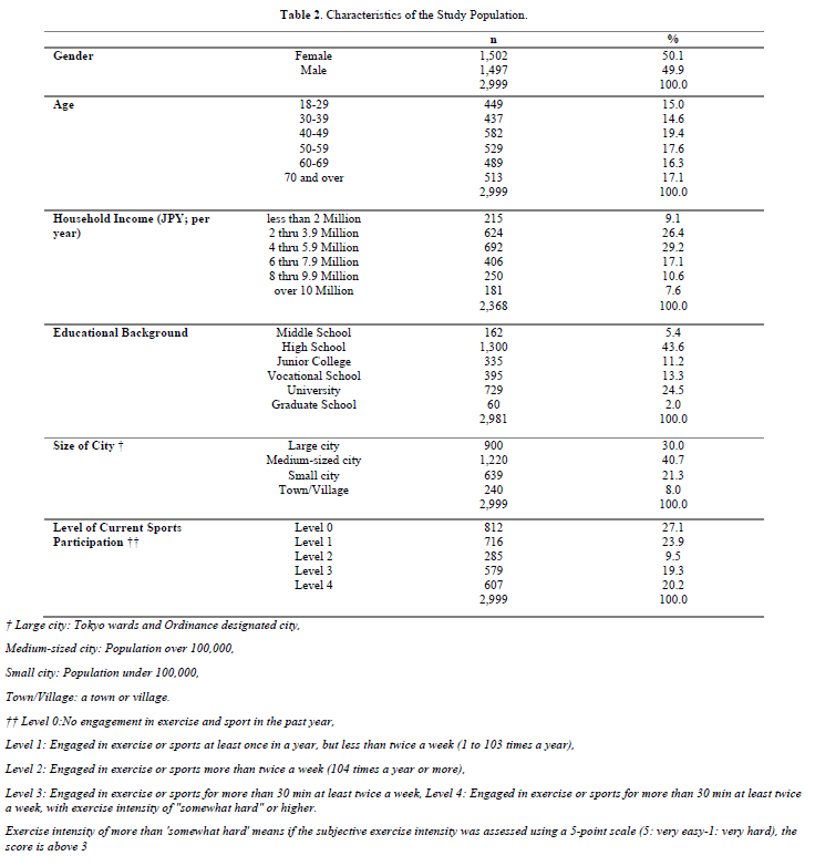 Regarding gender, participants were evenly distributed between males (50.1%) and females (49.9%). In terms of age, the 40s age group had the highest representation (19.4%), while the 18-20s (15.0%) and 30s (14.6%) had lower percentages. Concerning economic status, the most common household income range was 4 to 6 million yen (29.2%), followed by 2 to 4 million yen (26.4%). As for educational level, the highest percentage of respondents reported high school as their highest level of education (43.6%), followed by university degree (24.5%). Regarding residence, the highest percentage of participants lived in medium-sized cities (40.7%), followed by those in large cities (30.0%). With respect to current sports participation, the highest percentage of participants reported Level 0 (27.1%), followed by Level 1 (23.9%) (Table 2).