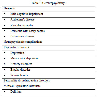 Gerontopsychiatry implicates oral and mental troubles, and constitutes the framework of psychic alterations (Table 1).
