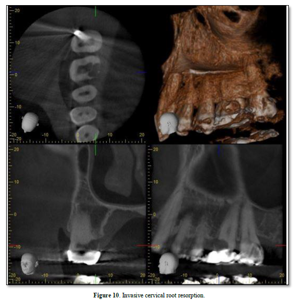 Cervical RR, a relatively uncommon form of external RR, is characterized by its invasive nature and can be detected by CBCT [58]. It tends to discolor the tooth crown giving it a pink hue (Figure 10) [53]. The exact cause of invasive cervical resorption is unknown; however, there is a strong correlation between orthodontic treatment, trauma, and intracoronal bleaching [59]. This type of resorption occurs below the epithelial attachments of the tooth [48]. As the source of infection is not the pulp, it has been suggested that bacteria in the sulcus stimulate and sustain inflammatory responses in the periodontium [60]. The destruction will continue until either there is no root structure left, or the inflammatory stimulus is removed by intervention [49]. Heithersay [61] has classified this type of resorption into four classes of severity with the proposed treatment regimens. Treatment may involve vital pulp therapy [62]; root canal treatment [42]; or surgical management [63], which may include topical trichloroacetic acid application, curettage, bioactive materials (e.g., MTA, Biodentine etc.) [64], and restoration with glass ionomer cement as needed [59].