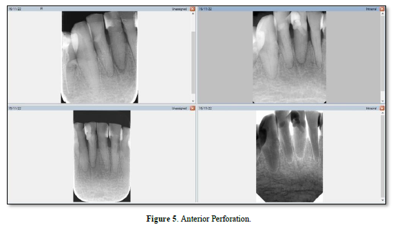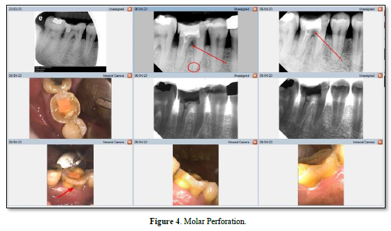 A perforation can result from pathologic or iatrogenic communication between adjacent periodontal tissues and the root canal system [21]. The prognosis for a perforation site depends on whether bacterial infections are prevented or treated [22]. Beavers et al. [23] suggest a periodontal lesion might occur if the perforation is close to the gingival sulcus, causing the gingival epithelium to migrate. The following symptoms may develop if the perforation site is left untreated: a presence of pus exudate, percussion sensitivity of the involved tooth, chronic gingival inflammation resulting from penetration of the alveolar bone, sinus tract formation, or the appearance of localized problems such as periodontal pocket formation or furcation involvement (Figure 4) [24]. Irritants from the periodontal pockets contribute to the perforation inflammation [25]. Perforation caused by a procedural error or mishap. Figure 5 is best referred to an endodontist for immediate management [26] because any delay in treatment will impact the surrounding periodontal health of the tooth and affect the overall prognosis.