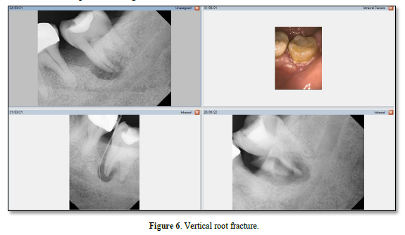A root fracture can also present as a primary endodontic lesion associated with periodontal disease [36]. A periodontal pocket may deepen locally or develop into an abscess, depending on the severity of the infection [37]. Long-term root fractures are often associated with PDL irritation, resulting in alveolar bone destruction [37]. Vertical root fractures (VRF) can cause progressive periodontal destruction, despite an overall stable periodontal state and proper endodontic treatment [38]. This is illustrated in Figure 6.