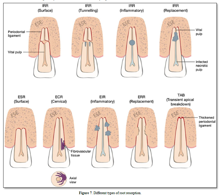 Resorption of the root canal wall inside a tooth is referred to as internal root resorption; and resorption of the external root surface is known as external root resorption [48].
