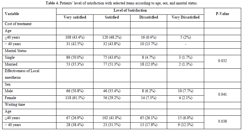 A total of 322 patients, 130 males and 192 females with an age range of 12-69 years, a mean of 32.74 and SD 12.48 were included in the study. The age group 10-29 years had the highest (120) number of participants (Table 1). Treatments that were offered included dental restorations in 113 (35%) patients, extractions in 93 (28.9%) patients, minor surgeries in 60 (18.6%) patients, and scaling/root planning in 37 (11.5%) patients (Table 2). High satisfaction levels in over 90% of the patients were scored in reception, cleanliness, and outcome of treatment. Waiting time had the highest 102 (31.7%) number of patients who were not satisfied followed by the effectiveness of local anesthesia (Table 3). Two hundred and one (62.42%) patients considered the fee for dental care as normal while 5.52% disagreed. Dichotomization along demographic lines showed that regarding local anesthesia females were more satisfied compared to males (p = 0.04). On waiting time patients who were aged 40 years and above were more dissatisfied than the younger group (p = 0.03) and on the cost of treatment patients who were married felt that it was high (p = 0.03) (Table 4).