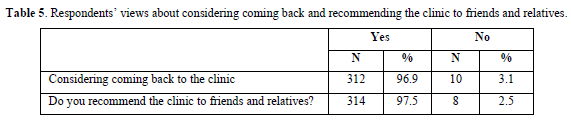 However, from a logistic regression analysis, to examine the relationship between independent variables (in this case, age, sex, education, income, and marital status) and a binary dependent variable level of satisfaction with the treatment outcome, there was no association (p > 0.05). Above 96% of the patients responded that they would come back for treatment if need be and over 97% responded that they would recommend the MUHAS dental clinic to a friend or relative (Table 5).