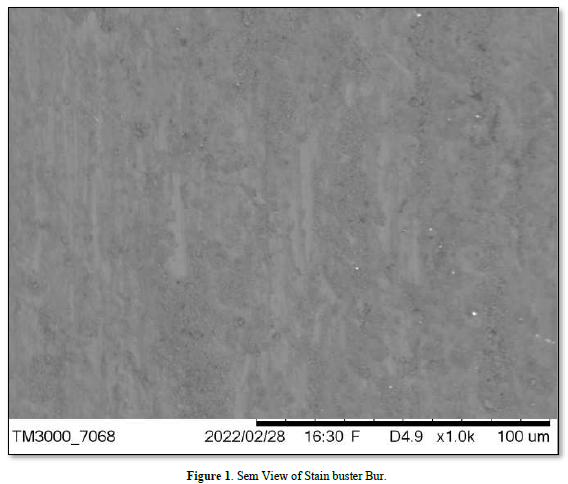 Result: The statistical analysis is carried out using ANOVA test followed by post hoc tukey test. The significant difference was determined in enamel surface roughness in the group wherein stain buster bur is used compared to the other groups.