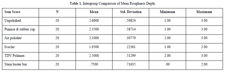 The results obtained from Scanning electron microscopy study revealed that in case of unpolished surface the average score calculated is 3. In the pumice and rubber cup group average samples scored 3. In the group of air polisher average samples scored 2. In case of samples in ivoclar all the samples averaged a score of 2, the samples of TDV polimax averaged with score 3 and lastly in case of stain buster bur samples scores averaged with a 1.