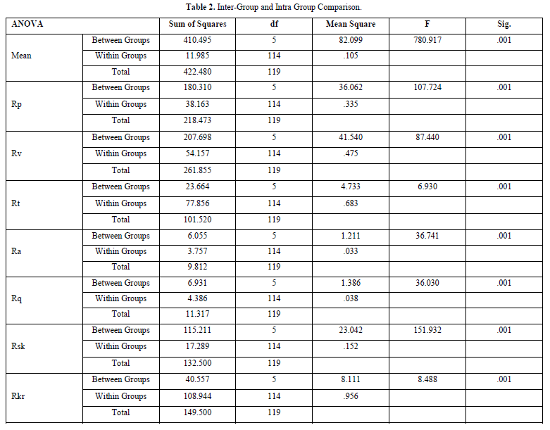 Intragroup and intergroup comparison was done to rule out for the mean roughness depth.