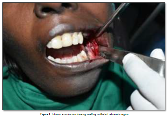 A31-year-old female patient presented with the chief complaint of painful swelling in the lower left back tooth region for two months.  The pain was of sudden onset, continuous in nature and increased on mastication. The patient was moderately built and poorly nourished. All the vital signs are within the physiological limits. Extra orally, facial asymmetry with a swelling on left side of size 2×2 cm. Antero posteriorly, it extends from 3cm behind the corner of the lip to the angle of the mouth. Superioinferiorly, from the line joining the corner of the lip to the tragus of the ear to the lower border of the mandible. The nasolabial fold is stretched and the patient felt pain while opening and closing the jaw. The overlying skin was smooth with no discharge. The mass was hard, tender and warm on palpation. Intraorally, the swelling extends from 37 to the retromolar region. Surface was smooth with no ulcerations (Figure 1).