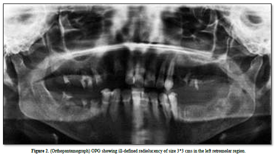 Complete blood investigations revealed an elevated lymphocytic count and elevated ESR. OPG examination showed an ill-defined radiolucency in the retromolar region of 3x3 cm in size, involving the inferior alveolar canal (Figure 2).