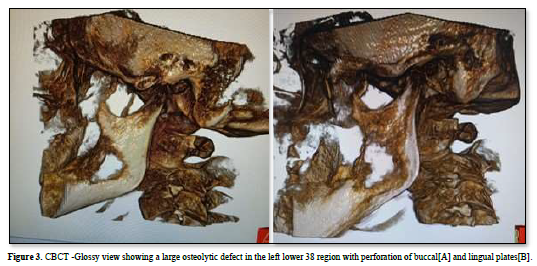 CT scan revealed a large osteolytic defect of size 3× 3 cm in the 38-region extending till the anterior border of the ramus with perforation of lingual & buccal plates (Figure 3).