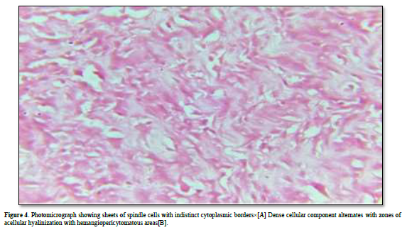 An incisional biopsy was performed under local anesthesia and submitted for histopathological examination. Hematoxylin and eosin-stained soft tissue section revealed pattern-less arrangement of spindle cells in a collagenous background with a prominent vascularity that results in a hemangiopericytoma-like pattern. Therefore, an interim diagnosis of solitary fibrous tumor was made based on the characteristic microscopic appearance. Subsequently, an excisional biopsy was done as the pain persists. Histopathological examination revealed sheets of spindle cells with focal areas of interspersed epithelioid cells. The spindle cells were plump shaped with indistinct cytoplasmic borders. Dense cellular component alternates with zones of acellular hyalinization. Cellular atypia was minimal. Mitotic figures were absent. Vascularity was moderate exhibiting hemangiopericytoma like areas and perivascular hyalinization of blood vessels. Differential diagnosis of hemangiopericytoma, fibrosarcoma and malignant fibrous histiocytoma was made (Figure 4).