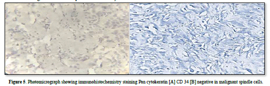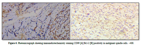 Immunohistochemistry showed strong positivity for CD99, Bcl-2and negative CD34, pan cytokeratin confirmed the diagnosis of monophasic fibrous synovial sarcoma. These results were consistent to the histopathological diagnosis (Figures 5 & 6).