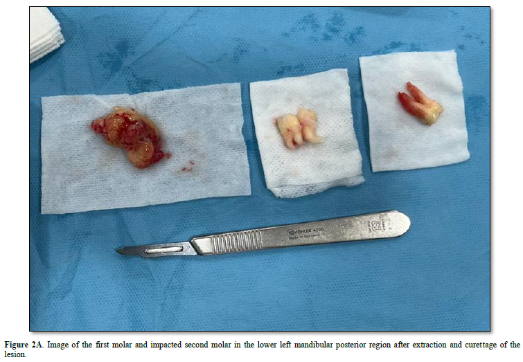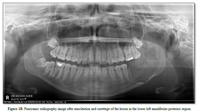 After local anesthetic agents were applied to the lesion area, a winter-style intraoral incision was made from the mesial of tooth number 34 to the margo anterior region of the ramus with the help of a scalpel. A full-thickness mucoperiosteal flap was raised and the lesion was accessed. Tissue with mucous consistency, myxoid structure and no bleeding was enucleated. Tumor-related teeth 36 and 37 were extracted while preserving the mandibular nerve. The obtained specimen was sent for pathological examination again for confirmation. The surgical area was closed primarily with 4-0 pegalac suture.