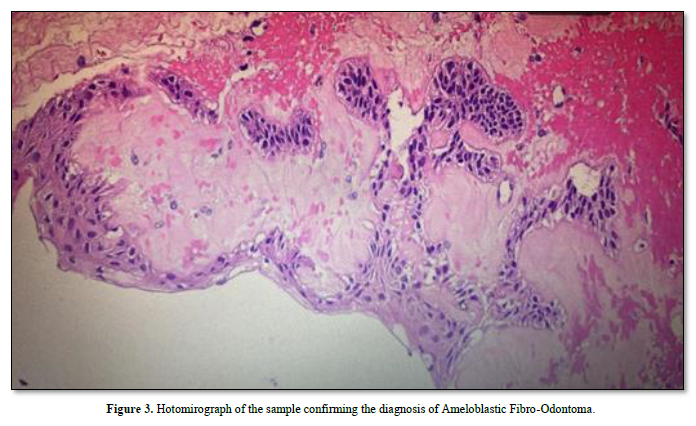 In the latest classification, WHO removed ameloblastic fibro-odontoma from the classification, considering it as an intermediate developmental stage of a tumor developing from ameloblastoma to odontoma. In this case, considering that we examined the entire tumor and that the dental hard tissue is seen in a very small focus and that fibroma and odontogenic-ameloblastic epithelium are determinants of morphology, it can be said that the prognostic process will be compatible with "Ameloblastic Fibroma" (Figures 1-3).