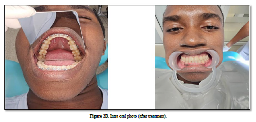 After 2.5 years of treatment, the appliances were removed, and a Hawley retainer was delivered to prevent relapse. Post-treatment evaluation showed that the treatment objectives were successfully achieved. The anterior open bite, overjet, and overbite were corrected, and the mandibular midline deviation was properly aligned (Figures 2A & 2B).