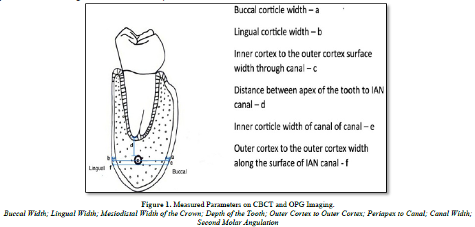 This figure illustrates various measured parameters used in the study for comparing OPG and CBCT images of impacted mandibular third molars, including buccal and lingual width, mesiodistal crown width, tooth depth, outer cortex-to-cortex distance, periapex-to-canal distance, canal width, second molar angulation, and height of the mandible.