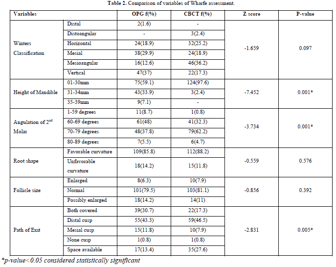 In comparing the Wharfe assessment variables between CBCT and OPG, the following findings were observed (Table 3):