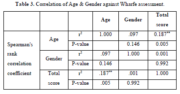 Table 3 presents the Spearman's rank correlation coefficients to assess the relationship between age, gender, and the total score based on the Wharfe assessment. The correlation between age and total score shows a significant positive relationship (r² = 0.187, P = 0.005), indicating that as age increases, the total score tends to increase as well, with a moderate strength of association. However, the correlation between gender and total score (r² = 0.001, P = 0.992) is negligible and statistically insignificant, suggesting no meaningful association between gender and the total score. Additionally, the correlation between age and gender (r² = 0.097, P = 0.146) is also weak and not statistically significant. Overall, age has a moderate and statistically significant correlation with the total score, while gender has no significant impact on the results.