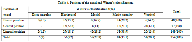 Table 4 presents the distribution of canal positions (buccal, central, and lingual) across different Winter’s classifications (distoangular, horizontal, mesial, mesioangular, vertical) in a total sample of 254 observations. The buccal position was most commonly associated with horizontal impactions (33.3%) and mesioangular impactions (29.2%), while the central position showed a higher frequency of vertical impactions (42.1%). The lingual position had the greatest frequency of mesioangular (38.9%) and vertical (28.2%) impactions. These findings suggest that the position of the canal is closely linked to the type of impaction, with the lingual position being the most common overall, contributing to 58.4% of the total sample. This distribution provides insights into the relationship between canal position and impaction types, which can help in surgical planning for tooth extractions. And, there were significant association seen between position of canal and winter’s classification with Pearson Chi-square value of 36.59, df (8) with p-value <0.05.