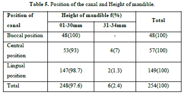 In this study, the distribution of cases by mandibular height (01-30mm, 31-44mm) and canal position (lingual, buccal, or central) is shown in Table 5. The results demonstrate a significant correlation between mandibular height and canal location, with a Pearson Chi-square value of 71.89, df = 2, and a p-value