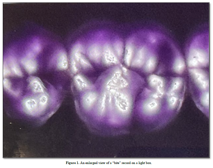 A definition of force is “an influence to change the motion of a body or produce motion or stress in a stationary body” (1). It can be described as a destructive element when an object propelled by a forceful thrust fracture, upon impact, an opposing object. Intensity of force increases with the forced movement of an anchored object (2). Force is used to move objects; intensity of force can break or bend them such as with teeth and crown restorations. The impact of opposing teeth and the force applied upon closure may be described as natural if the teeth function in harmony (3). Force distribution will be even. If the force distribution is uneven then impact upon closure may contribute to a poorly functioning occlusion. Intensity of occlusal contact occurs in any resistant area of a working occlusion. Tooth grinding, tooth and crown breakage, TMJ pain, and general malaise are often attributed to an unbalanced and maladaptive occlusion. A patient cannot treat an uneven bite by self-imposed tooth grinding (4). Uneven force distribution and contact intensity should be treated by a skilled clinician. We record occlusal contacts in conventional bite impressions (5). Contacts are then identified and classified by using image analysis. Searching for ideally placed occlusal contacts with matching cusp fossa designs is misleading because they are non-existent. Intense areas of contact are clearly visible and can be identified (6). Bite force and occlusal patterns are unique for each individual. Bite force can be measured using a force gage. The maximum bite force for a human is 160 pounds per square inch. In comparison over 4000 pounds per square inch was measured in the now extinct Megalodon shark (7). Force is a destructive element when occlusal contacts are not balanced. Resultant tooth damage increases with self-inflicted tooth grinding and bruxism. At present there is no way to record occlusal contact imbalance. The usual dental visit does not include an occlusal exam other than visual identification of Angles’ orthodontic classifications of jaw positions. Using an imaging system a clinician can see and categorize occlusal contact and non-contact areas of the occlusion (Figure 1). Training is necessary to learn how to make a suitable occlusal impression and to interpret the findings. A non-set impression material that is used to record the bite can also be used to make immediate repetitive bite recordings. No two repetitive bites are exactly the same as are no two rhythmical beats of one’s pulse. If recordings of the bite are not repetitive then the results from the recordings will remain in question. Attention to detail when taking impressions is necessary to obtain accurate records. Zirconia crowns are hard and unyielding. Implants are rigid posts. Differences in the mechanical properties of restorative materials makes the intensity of force driven vectors a factor when designing and constructing an implant restoration. If some restorative units bend, and others do not then a compensatory occlusal design must be incorporated into the manufacture of the restoration. Image analysis can be used to avoid incorporating areas of intense contact.