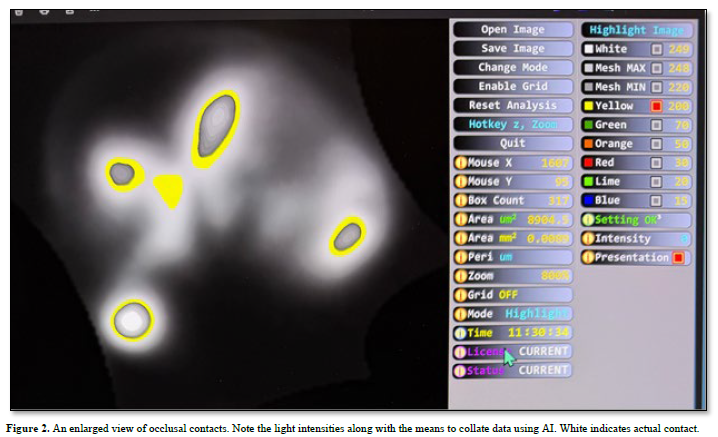 Areas can be isolated and further examined (WY). Area content along with light intensity measurements as shown represent the anatomy of an occlusal contact (Figure 2). Such information is permanently recorded. Systems that monitor dental occlusion are scarce. The current use of force sensors in pliant occlusal wafers does not address occlusal contact areas. An occlusal profile of the occlusal anatomy along with contact intensity is not addressed. Anatomy and contact intensities are essential elements in the design of implant restorations. Occlusal repair and early diagnosis of malfunction are assessed by studying occlusal contacts and their associated wear patterns. At present the only way to do this is by analyzing bite registrations using an image analysis program. Permanent records can be used as a baseline for comparison with present day findings. Maintaining good health is the ultimate goal of restorative dentistry.