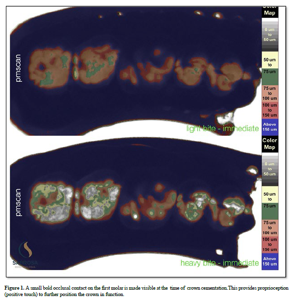 An occlusal stop often referred to as a centric stop takes place upon tooth contact. There are many stops in the posterior occlusion. They hold the mandible in position and make efficient mastication possible (1). The occlusion becomes unstable if dentists advocate removing stops while restoring teeth. Removing stops insures less trauma on new restorations. The mandible will slide forward if two or three stops which are referred to as holding cusps are removed (2). To offset the loss of contact the dentition is ground down by the patient in an attempt to stabilize the bite. If the anterior teeth remain stable then the sliding stops; if not the anterior teeth loose their guidance. Stability cannot occur because there are no holding cusps. The dentist upon routine examination looks and says “we will wait and see” and prescribes a night guard for the all day, all night, grinding. Endodontically treated teeth maintain a diminished sense of touch upon occlusal contact because the nerve plexus has been removed (3). The mechano-receptors in the periodontal housing remain active but their effect is diminished (4). Touch in humans can only occur if there is physical contact (5). Each tooth has it’s own sensory system. If a restoration has no occlusal contact then the occlusal contact areas of the adjacent teeth will shift (6) Closing forces on the teeth will become uneven. To regain occlusal balance a patient will self adjust (7). A non alignment of the teeth may follow with a pseudo positioning of the closed jaws along with a slight loss in vertical dimension. Under occluding a restored tooth is known as “ditching”. There is no occlusal contact. There is an assumption that the restoration will rise into a functioning occlusal position but that is unproven. If some actual physical contact is programmed into the occlusal profile at the time of crown delivery then occlusal contact will be assured and self adjustment will take place over time (8) Figure 1. It will never be ideal but it will be functional. The only means to record the occlusal contact areas with their various intensities is by using a recording scan which is linked to an image analysis program (Image J). Heavy and light closures of a patient are recorded using a silicone impression material in a quadrant triple tray (9). The set impressions are individually placed on an illuminated light box which is positioned six inches below a fixed camera which is connected to the image analysis program. Images are digitized and converted to color and displayed on a computer screen. The digitized records are permanent and can be used at a later time for reference. The dental materials we choose for the under structure and crown restoration are significant factors for longevity. There is no clinical research that provides guidance on the choice of restorative materials. Bench top studies offer minimally constructive information. Ultra hard materials such as zirconia are inexpensive and indestructible. They can be milled at the chair. When articulated against an opposing tooth the weaker tooth structure will fracture. Softer materials such as resin reinforced composites are a good substitute but in function they lose their occlusal anatomy. Gold is a proven material but it is costly and cannot be milled. As to restoring the understructure there is little if any substantial clinical research. It is all speculative. Perhaps what is missing in this story is planning before or after treatment. How will this treated tooth be restored? What materials for the under structure and superstructure will be employed?