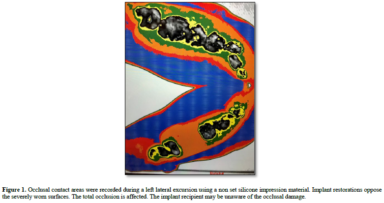 To touch is to contact (1). Touch sensitivity is missing in implant supported restorations (2). Vital teeth in periodontal housings are touch sensitive (3). Touch sensitivity accompanies tooth positioning upon occlusal contact (4). Implant restorations are made from Zirconia which is a ceramic type of metal. It is hard and unyielding (5). Wear in function is minimal. Implants are immovable. They are not touch sensitive. Centric relation is a retruded jaw position which is fixed in space (6). It is a repeatable rotating position which dentists use as a starting point in extensive reconstructions. Most often clinicians do not use the position because it is difficult to find and record. Dentists use a retruded mandibular position which is not repeatable. The position is recorded by making an inter occlusal record. The record is used to position dental casts on an articulator. If the record is incorrect then all of the jaw movements simulated on the articulator will be inaccurate. Upon insertion of a prosthesis the cusp fossa relationships between teeth and implants will clash as a destructive occlusal contact scenario develops. The patient will not sense the difference because implant restorations are not touch sensitive. In a true centric relation oriented case a cusp fossa relationship is developed for each tooth. Opposing cusps fit into matching fossae which are positional stop areas for occlusal contact. The adjacent cusp/fossae areas are used to guide the cusps when they idle and function. There is an established rhythm which is developed for each patient. In the past centric relation cases were made for wax forms which were cast in gold which wears well in function. All teeth were supported by a periodontium which contained many touch receptors. There were no implants . Today zirconia is the preferred material for implant restorations. Implants have little proprioception because they have no touch receptors. When a dentist restores implants the recipient can not sense the intensity of occlusal contact. A balanced occlusion can not be evaluated by the patient (Figure 1).