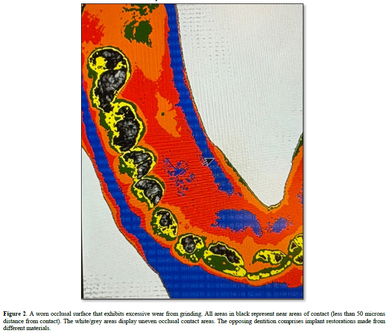 The clinician uses marking papers to measure a balanced bite but his/her measuring system is inadequate (7). The patient determines comfort when touch sensitivity is non existent. Most completed cases survive; some fail. Broken ceramics, reduced bone height, and bacteria infected implant surfaces may occur over time. The working occlusion is not monitored. There are no permanent occlusal contact records. Although dental implant reconstruction is a medical achievement we still use older methods to guide us. Some methods and materials no longer fit modern day protocols. New treatments use new materials. An uneven occlusion with mixed restorations will create occlusal damage Figure 2.