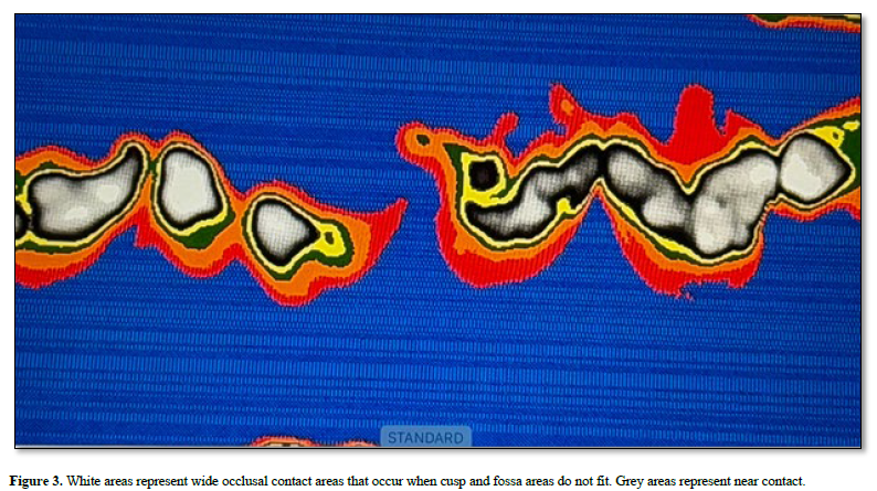 Opposing cusps and fossae should not interlock Figure 3. Occlusal stops should suffice and adjacent occlusal areas should be wide with accompanying shallow slopes or flat surfaces. Older philosophies can be altered to allow for newer techniques and procedures. Occlusal contact records should be saved and periodically reviewed (8). In order to record the occlusion permanently we use a non resistant instant forming silicone impression material. The material is placed onto an adjustable triple tray frame and the patient is asked to bite hard. Rehearsal may be required. The impression is instant. The impression is removed and placed onto an illuminated surface on a digital scanner and a photograph is taken from above (9). An image analysis program is used to evaluate film intensities in the resultant black and white photograph. Color is added for easy viewing. White is contact. Black and grey are near contact areas. In general implant restorations are a success. Occlusal examinations should be made yearly and adjustments made when needed. Prevention is always the goal.