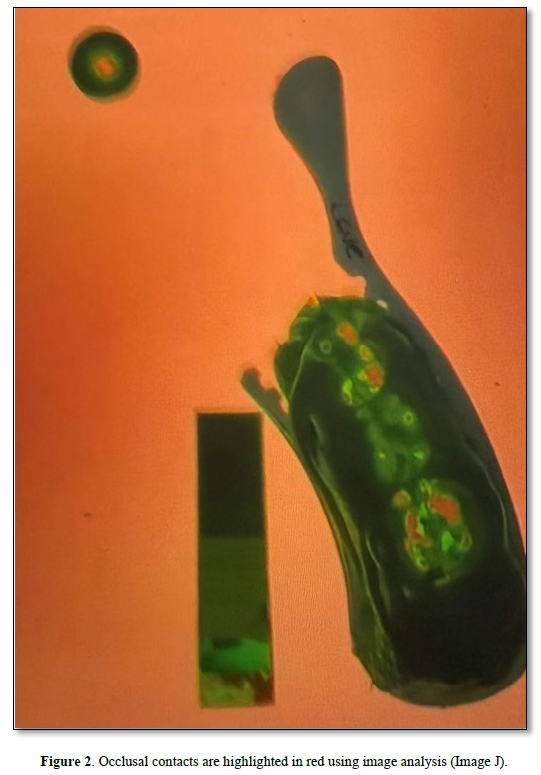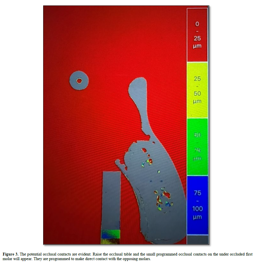 To make a permanent record an inter occlusal impression is made in a triple tray and the impressions is positioned on an illuminated light box (9). A photograph is taken from above and a permanent record is made. The resultant black and white photograph is processed using an image analysis program. Density changes are measured and recorded. A calibrated color scheme is added for visual assessment (10). The color red signifies occlusal contact Figure 3. This recording system is accurate. It was constructed to measure occlusal contact. The making and taking of an accurate impression is the controlling factor. It takes time to learn about the dynamics of occlusion. Practice is suggested.